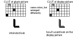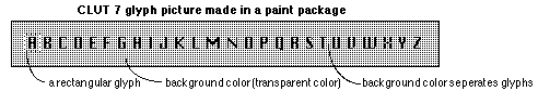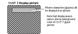 Important: The picture containing the glyphs and the display pictures MUST share the same Palette. This is usually referred to as using a SUPER PALETTE for both the glyph picture and display pictures. It is also important that the background color in the glyph picture match the display area color in all pictures. Failure to do this will cause the characters placed on the display pictures to have random coloring, or "outlines" that are off color.
