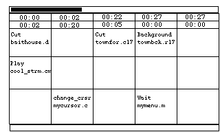 baithouse.d is at the front of the script, so Mogul just waits until it's loaded before starting the timer. cool_strm.cm requires no load time. mycursor.c is a small file (under 10k), so we allowed 00:02 of time for it to load from the CD. Note that the 00:02 was specified in the column BEFORE mycursor.c.